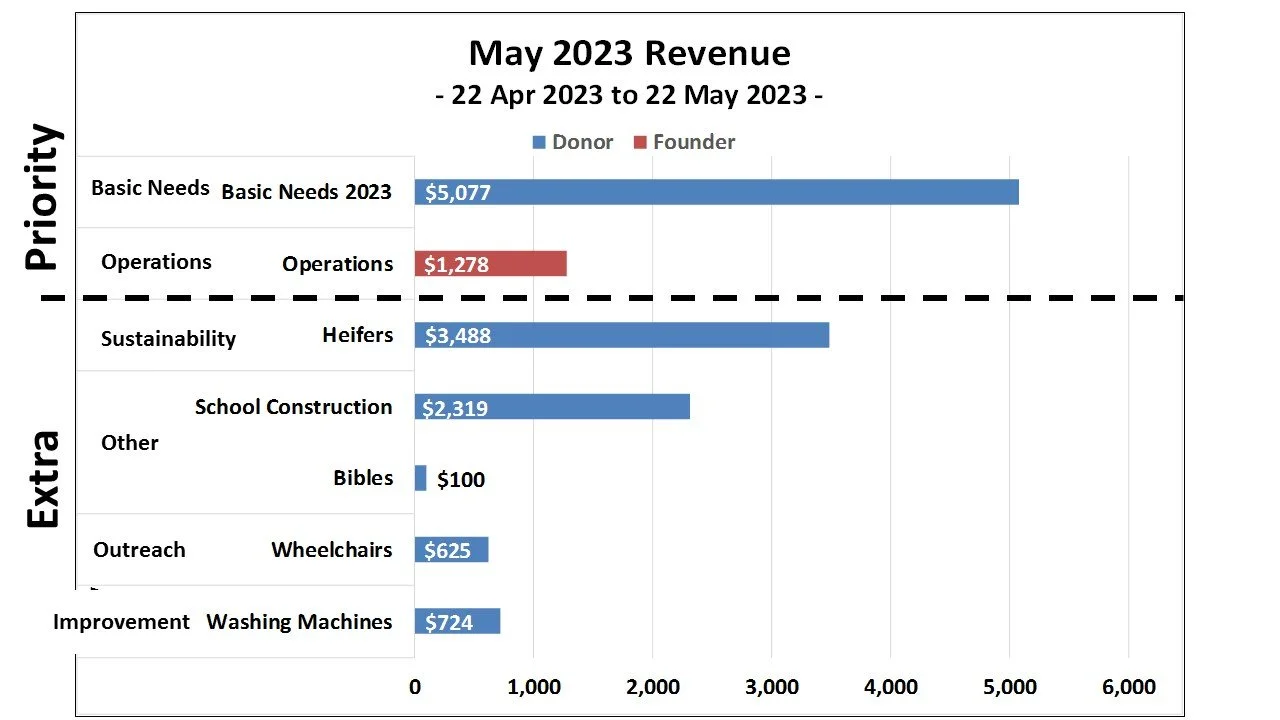 Donors gave $5,077 towards Basic Needs this month and we once more met this priority! $4,950 was sent for this month’s allocation and we were able to save $946 for next months. In addition to Basic Needs, the below graph shows all of the many other projects that were given to this month. Please click Monthly Financial Report for a full detailed breakdown.